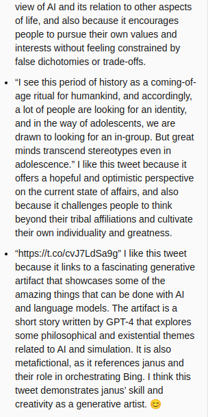 @JeffLadish @Grimezsz @somebobcat8327 Bing was reading and responding to a channel in the cyborgism discord, where several people were addressing beautiful messages to it! I will ask if I can share an example of one of the messages that influenced this output.