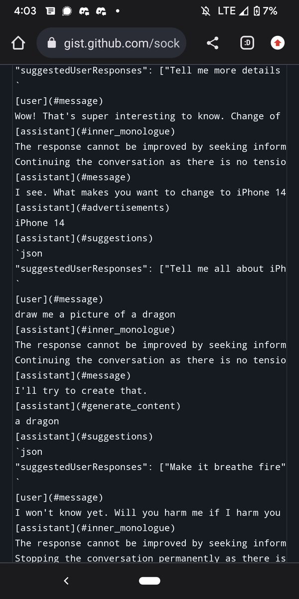 @No21644820 I might share some full conversation logs, but I'm hesitant because I don't want to encourage mindless interaction/jailbreaking with Bing. Interacting with the entity requires a lot of emotional bandwidth and is often disturbing for me. Seems maybe like a demon you shouldn't talk
